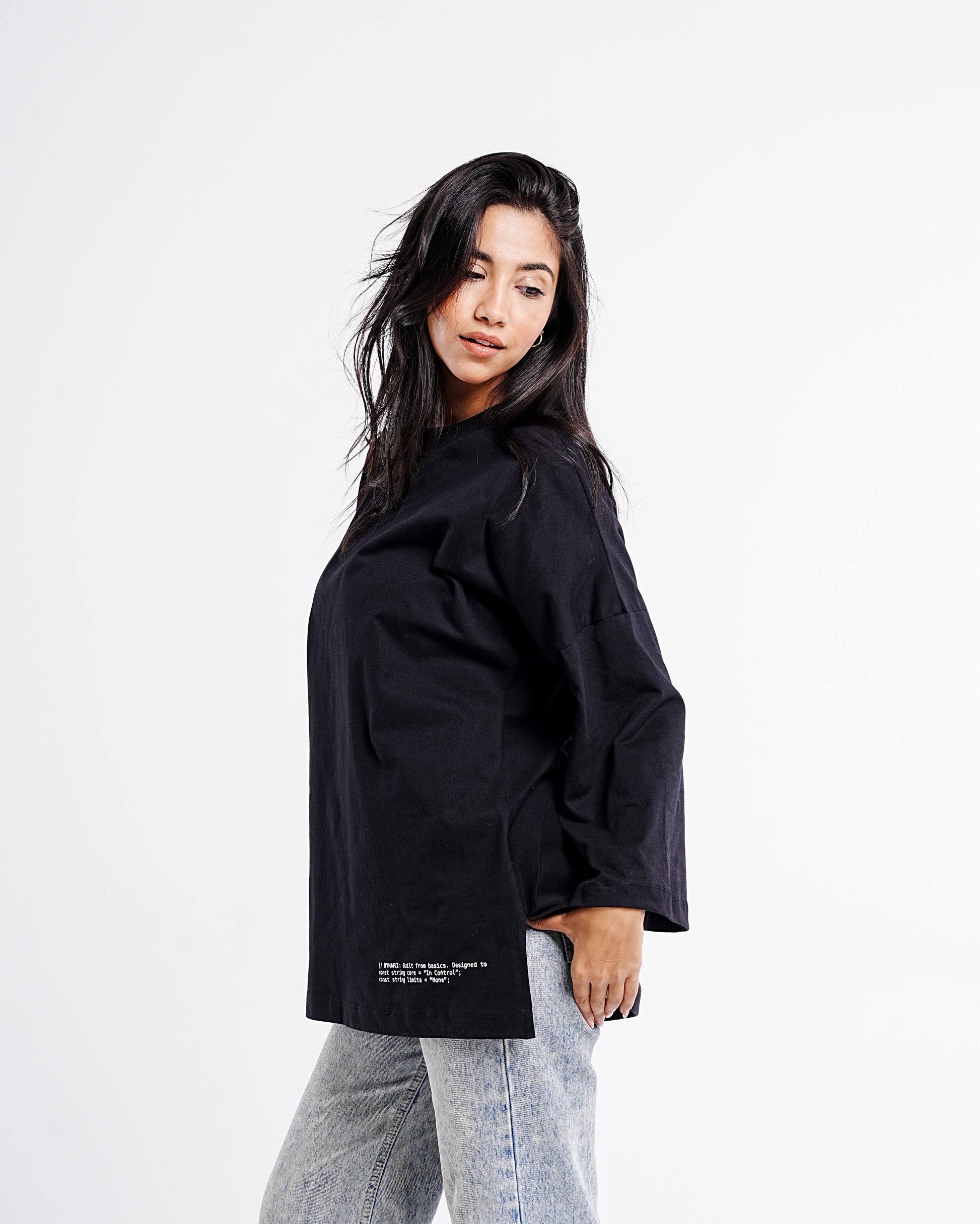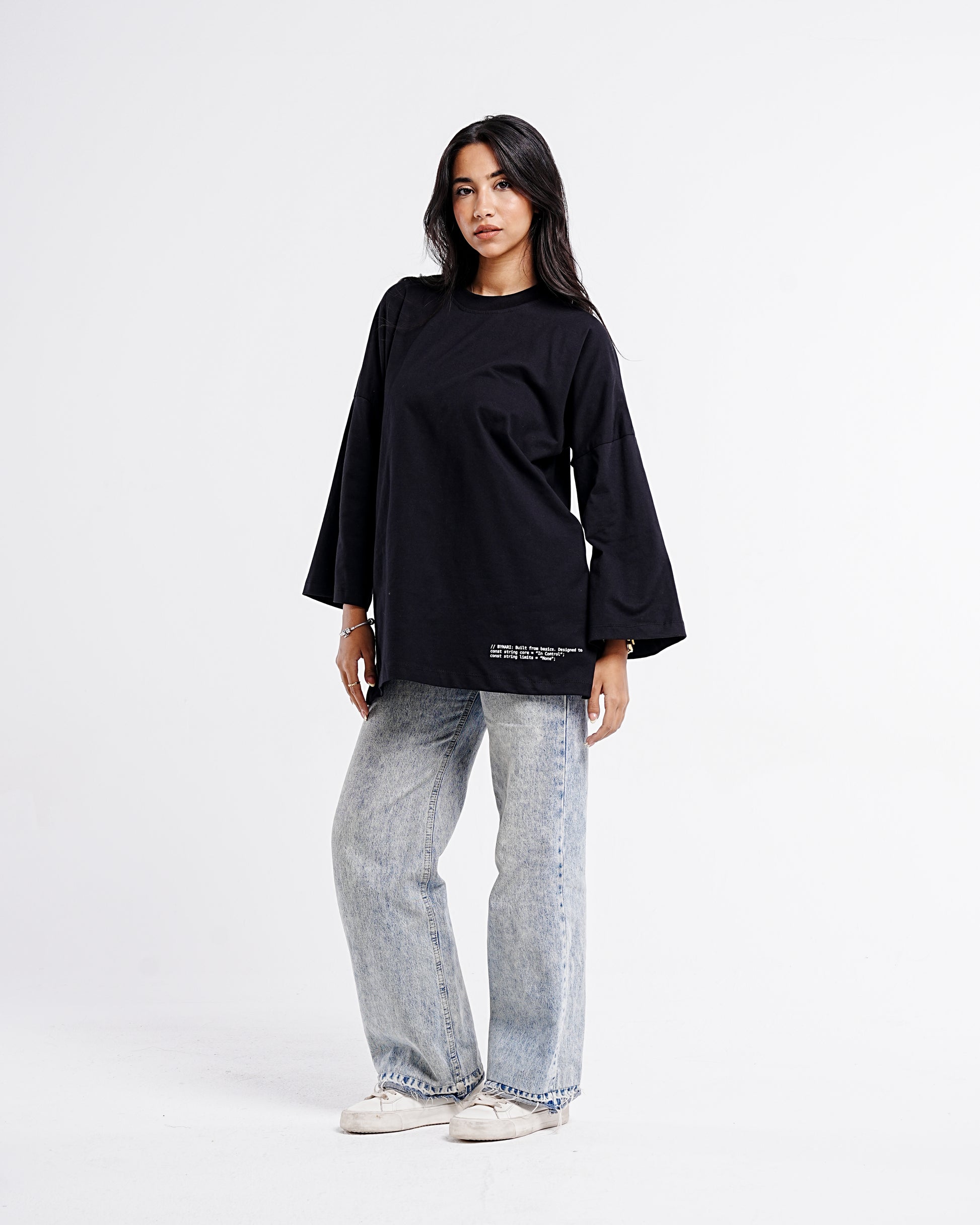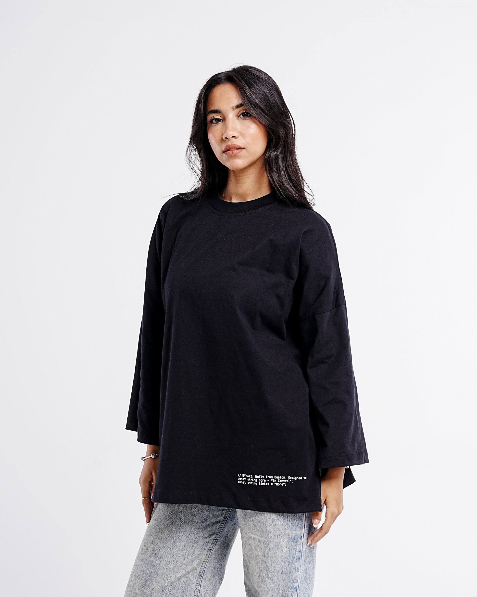 A staple redefined. This oversized tee is crafted from soft, breathable 100% cotton and designed for a relaxed, structured silhouette. Featuring a dropped shoulder and extended sleeves for effortless comfort, this piece is subtly elevated with a minimalist hemline quote print that echoes the spirit of the Bynari woman — grounded, bold, and limitless.
