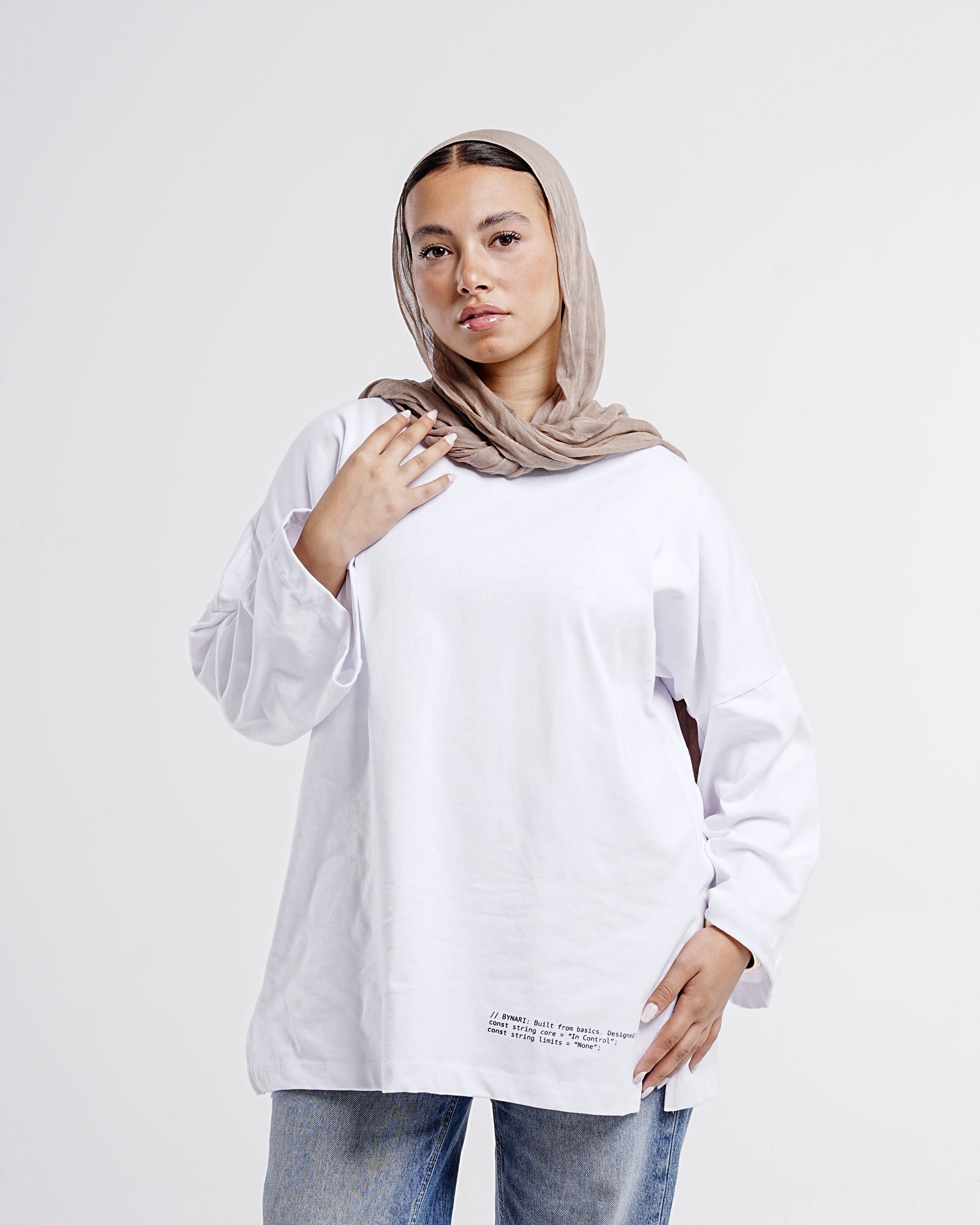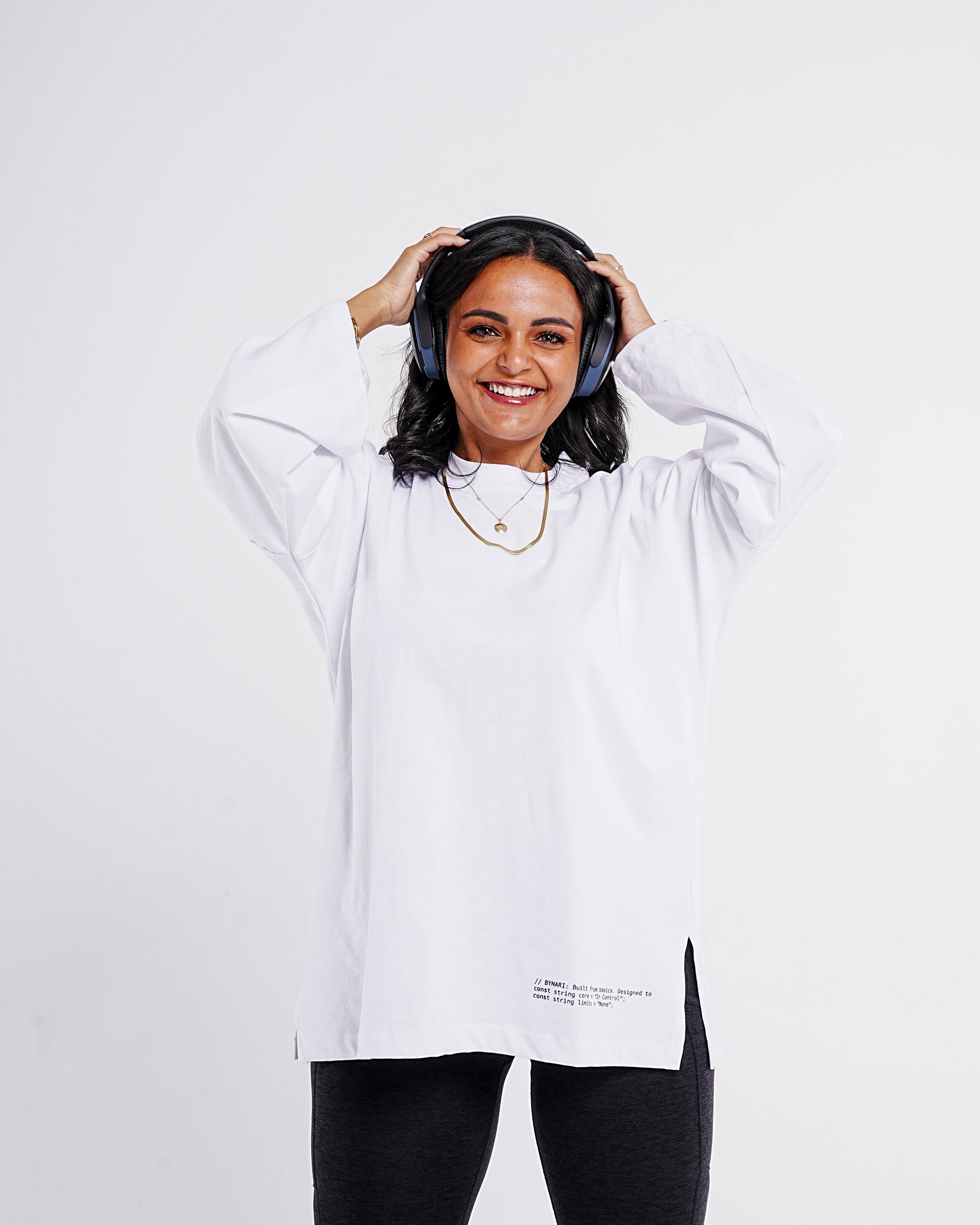 A staple redefined. This oversized tee is crafted from soft, breathable 100% cotton and designed for a relaxed, structured silhouette. Featuring a dropped shoulder and extended sleeves for effortless comfort, this piece is subtly elevated with a minimalist hemline quote print that echoes the spirit of the Bynari woman — grounded, bold, and limitless.